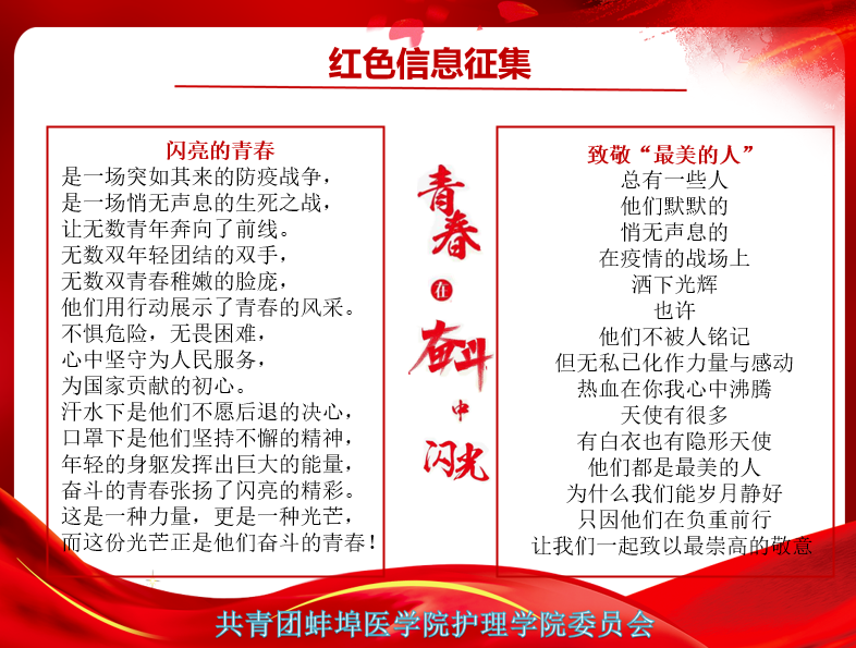 为纪念“五四”运动101周年和第109个国际护士节,引导学生增强“四个意识”,坚定“四个自信”,做到“两个维护”,同时积极响应习近平总书记对全国广大护士的祝福和慰问讲话精神,太阳成集团官方网站在全院学生中开展疫情防控和决战决胜脱贫攻坚红色信息征集评选活动。