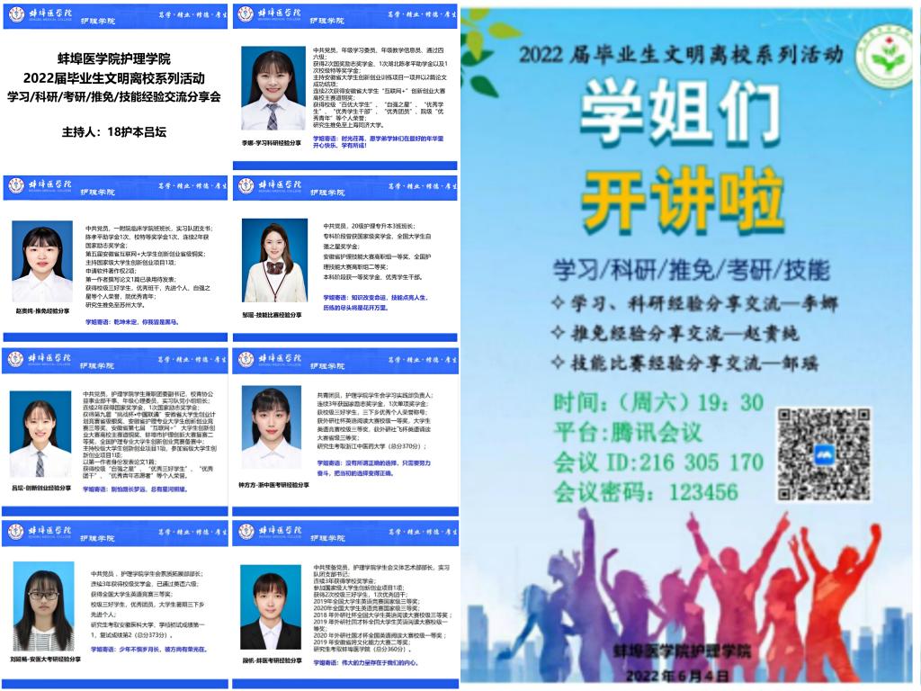 “心之所向,披荆以往”经验分享交流会。6月4-5日晚吕坛、邹瑶等7优秀毕业生分两场通过腾讯会议向2019、2020和2021三个年级学弟学妹们进行了学习、科研、创新创业、考研和推免,以及技能操作等方面的经验交流和分享,躬身力行为同学们上了生动的一课,在考试月即将来临之际为同学们注入了加油奋斗的强心剂,以学姐为榜样在未来的医学路上走出青春奋斗步伐去实现梦想。