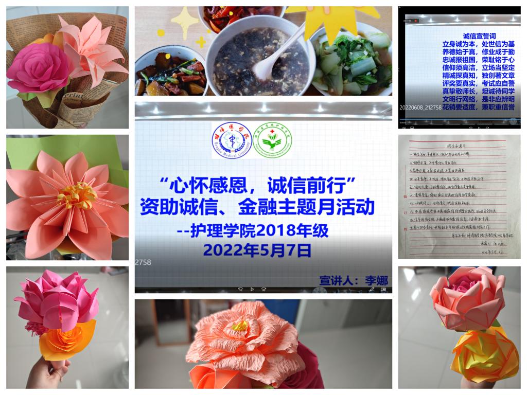 “心怀感恩,诚信前行”诚信感恩主题教育。以诚为本,懂得感恩,为进一步加强毕业年级学生诚信、感恩教育和劳动教育,弘扬中华民族的传统美德,太阳成集团官方网站在5月开展诚信感恩主题教育活动,如资助政策宣讲,线上送祝福、给妈妈做顿饭、送手工花束感恩行动,签订诚信承诺书和诚信宣誓等,以此“播种诚信,收获品格;笃行诚信,增色人生”,教育学生扣好人生第一粒扣子,弘扬孝敬父母、珍爱亲情、感恩他人(老师、家人、朋友等)的传统美德,培养感恩的心,增强学生的感恩意识,激发感恩之情,增强社会责任感和使命感,引导毕业生“在青春的赛道上奋力奔跑,争取跑出当代青年的最好成绩”。