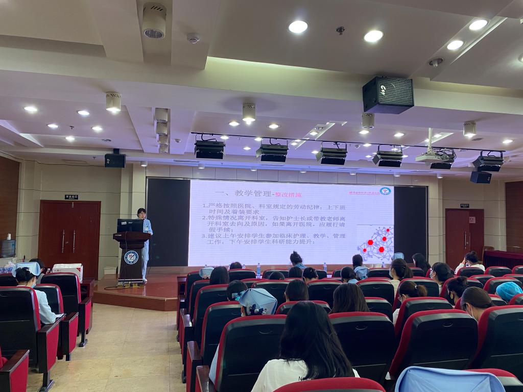 一附院护理研究生管理人员杨从艳主任护师首先对临床科室教学检查情况进行了反馈,从教学管理、教学计划、教学过程及教学评价等方面指出了检查中发现的问题,提出了整改要求。然后科室带教老师和学生就临床教学落实情况进行了座谈,从纪律要求、针对不同培养方向的教学计划制定、科研能力培养、思政教育、临床能力考核形式、个案及病例书写要求、床边教学形式等方面提出临床教学及学习中存在的疑惑和困难,学院学科及研究生管理办公室朱宁宁教授从落实专硕培养方式、培养目标、毕业要求、管理制度等方面解答了临床教学的难点问题,并确定了下一步工作重点。
