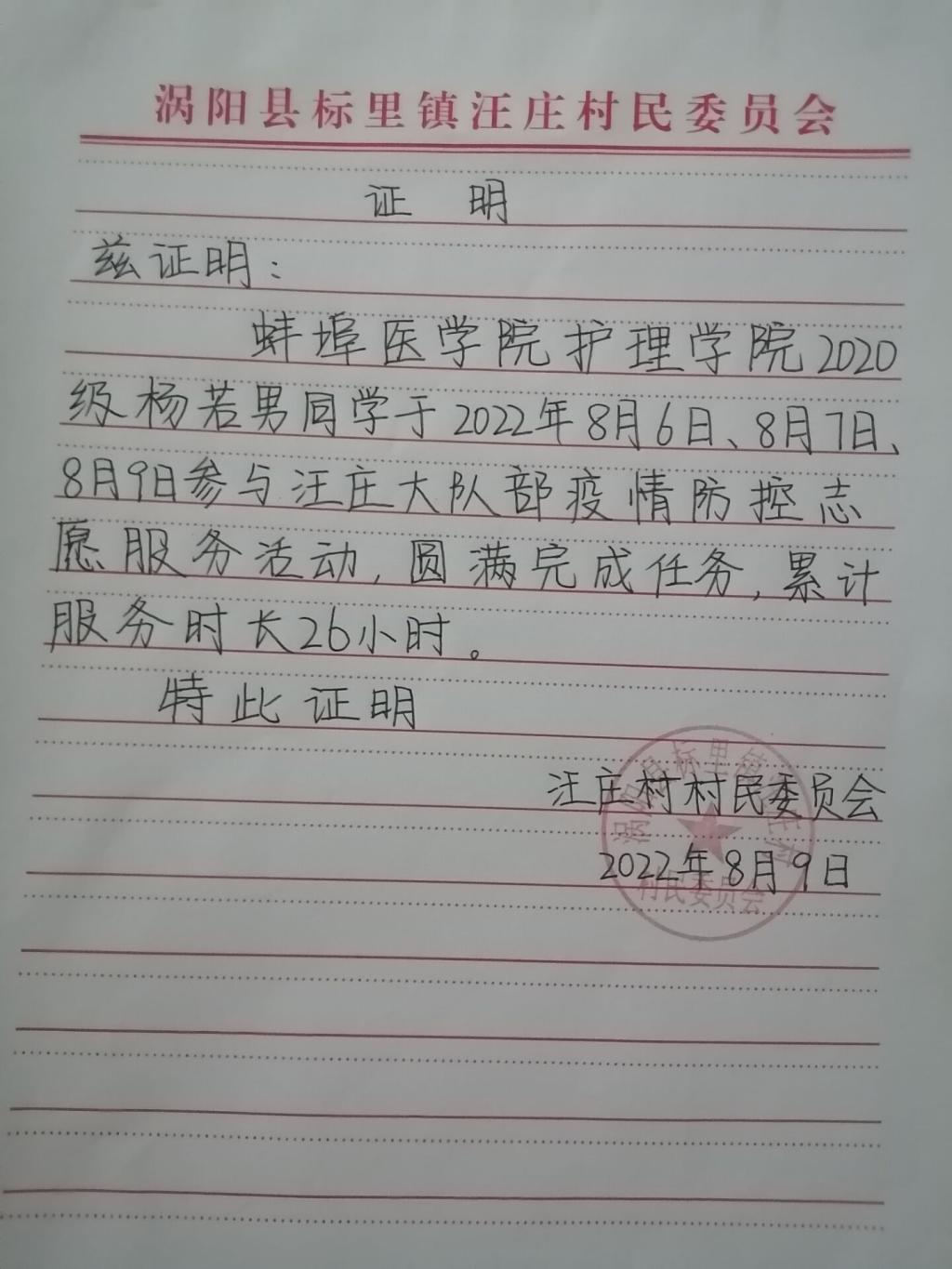 8月初,亳州市涡阳县第二轮疫情来袭,在面对涡阳家乡疫情严峻形势背景下,作为一名医学生和预备党员,蚌埠医学院太阳成集团官方网站2020年级学生杨若男同学奋勇争先,主动担当。8月6日至13日,在安徽省亳州市涡阳县标里镇汪庄大队部积极响应大队领导的号召,在领导的悉心指导和照顾下,开展了志愿者的工作。前期完成核酸采样点布置、核酸信息采集、老年人防控疫情宣教等工作,后期负责家乡的核酸人员采集工作。
