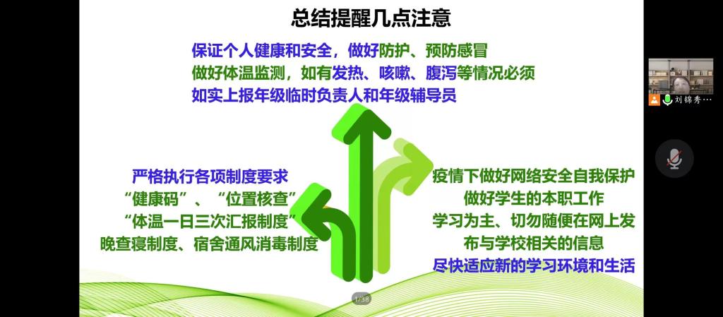 会上,刘锦秀老师着重从报到前健康档案建立,报到途中安全防护措施以及报到后相关安排等方面进行具体介绍。强调了提高反诈骗意识的方法和重要性。使新生和学生家长对学校、学院以及专业概况有了进一步的认识,对报到流程及准备工作有了进一步的了解。