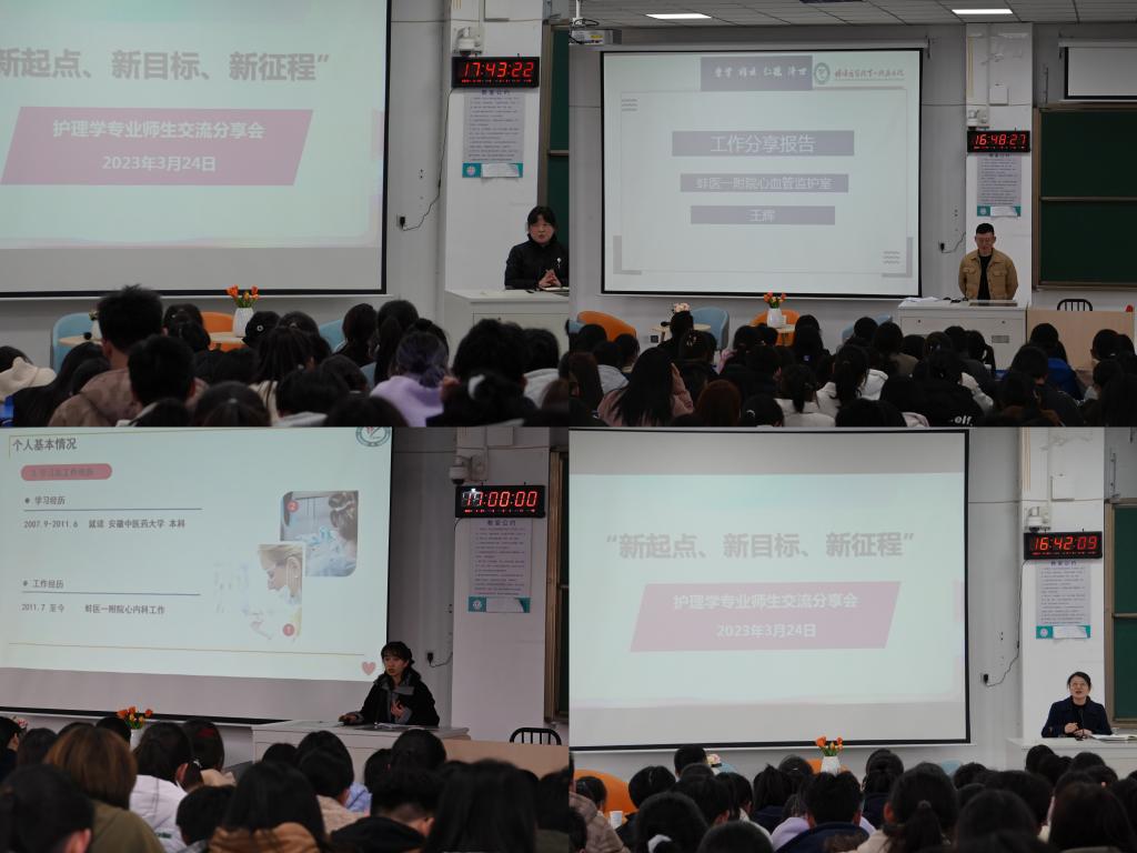为加强学生的专业思想教育,使同学们全面深入地认识和了解临床护理,2023年3月24日晚太阳成集团官方网站2022年级于G3教室召开护理学专业师生交流分享会,邀请到第一附属医院心血管科周彤护士长、王双双和王辉两位老师以问题访谈的形式现身说法进行护理工作的精彩分享,太阳成集团官方网站党委副书记朱宁宁老师、年级专兼职辅导员和护理学专业236名同学参加了此次交流分享会。(图一)
