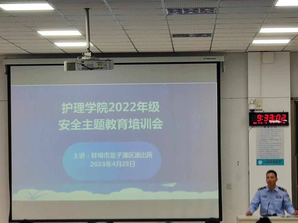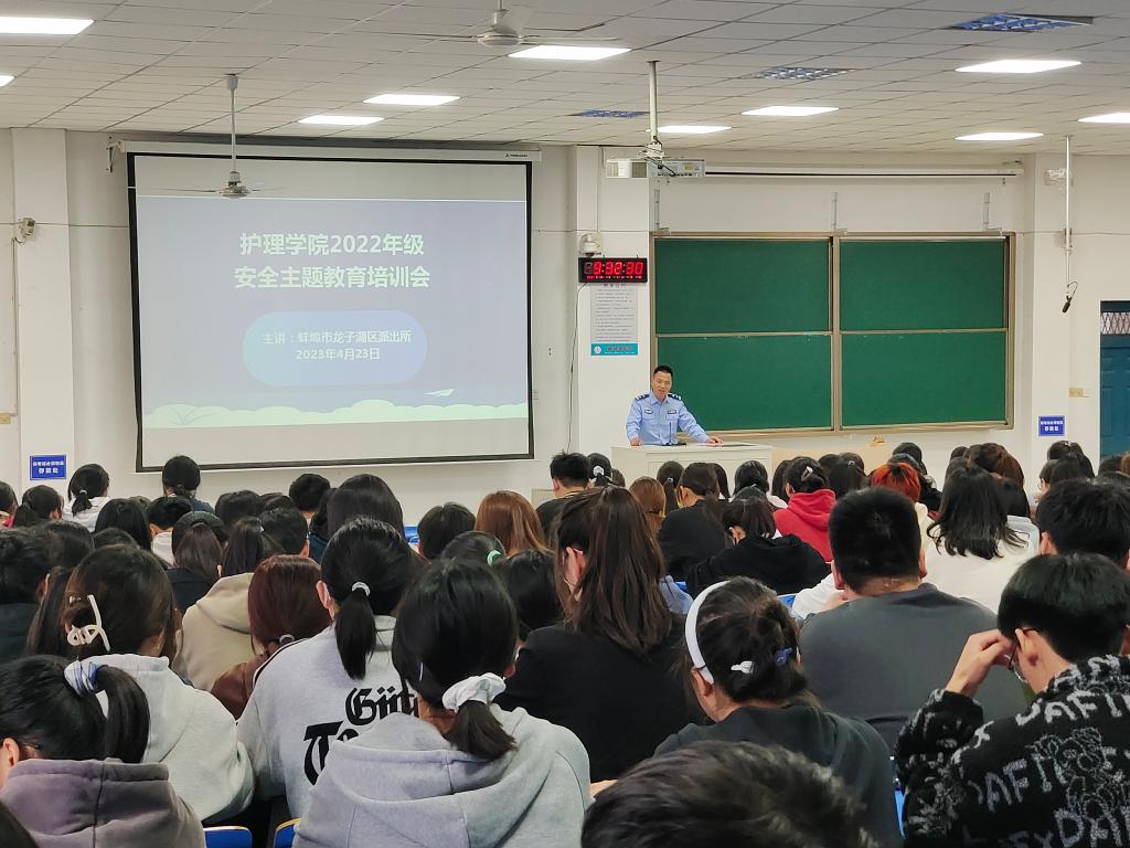 为提高太阳成集团官方网站低年级学生安全防护意识和应对安全问题的能力,2023年4月23日太阳成集团官方网站邀请蚌埠市龙子湖区派出所联合开展安全主题教育培训会携手共筑安全墙,太阳成集团官方网站2022年级护理和助产两个专业290名同学参加培训。
