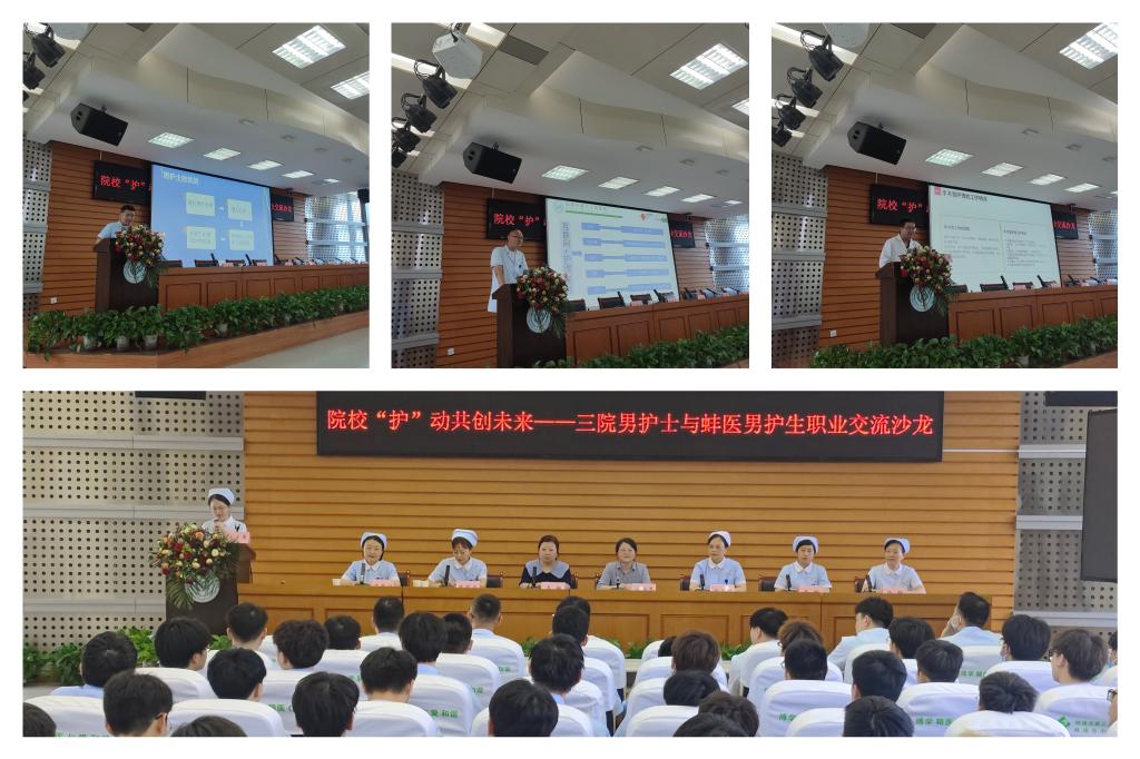 为进一步加强太阳成集团官方网站2022年级护理学专业男生专业思想教育,帮助他们进一步了解临床护理工作内涵、坚定职业信念,制定未来职业发展规划,2022年7月3日下午在蚌埠市第三人民医院举办院校“护”动共创未来——三院男护士与蚌医男护生职业交流沙龙活动,共53名男护生和10名临床一线男护士,以及三院护理部相关负责人,科室护士长等参加。