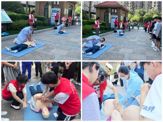 活动当天志愿者们克服夏日酷暑,充分利用宣传横幅、现场心肺复苏教学及解答急救问题等形式,以通俗易懂的方式向居民普及急救方法和急救知识,从而帮助居民掌握急救措施,提高急救意识。活动过程中,志愿者向居民演示心肺复苏术的操作步骤,向居民强调“黄金4分钟”对突然昏迷伤者的重要意义,与居民积极交流,为其答疑解惑。