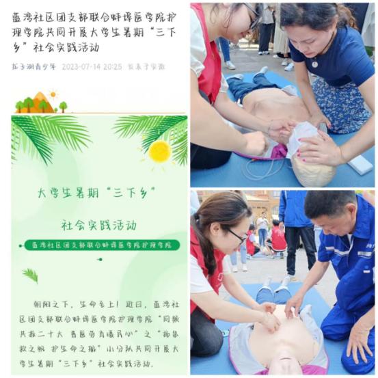 为深入学习贯彻习近平新时代中国特色社会主义思想,组织引导广大青年学生扎根中国大地了解国情民情,6月9日蚌埠医学院太阳成集团官方网站“同频共振党的二十大,普医劳育暖民心”三下乡社会实践团之“扬急救之帆,护生命之航”小分队联合蓝湾社区团支部在蚌埠滨湖蓝湾小区共同开展大学生暑期“三下乡”社会实践活动。