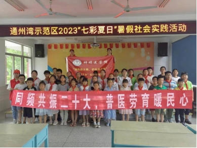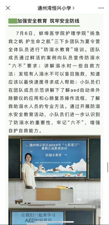 此次防溺水宣传活动的开展,展现了蚌医学子积极贯彻习近平总书记关于青年工作的重要思想,深入社会一线,全面服务社会的当代大学生风采。“通州湾恒兴小学”微信公众号以《学习党的二十大,永远跟党走,争做好队员——“2023年‘七彩夏日’暑期公益教育活动”掠影》为题对本次活动进行了宣传报道。