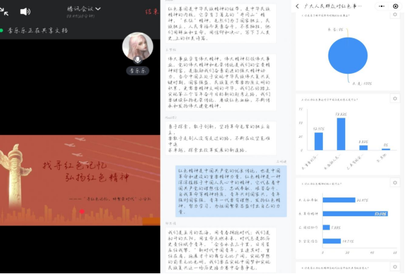 实践团队还通过腾讯会议进行思政宣讲,通过线上宣讲将实地参观的经历、知识和感悟分享给更多的人。在宣讲结束后让青年学生参与其中,发表他们对红色记忆的认识与看法,让大家通过聆听宣讲学习和讨论感悟红色精神。