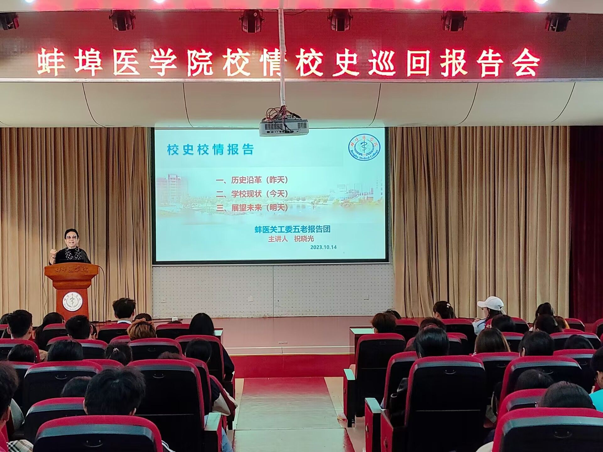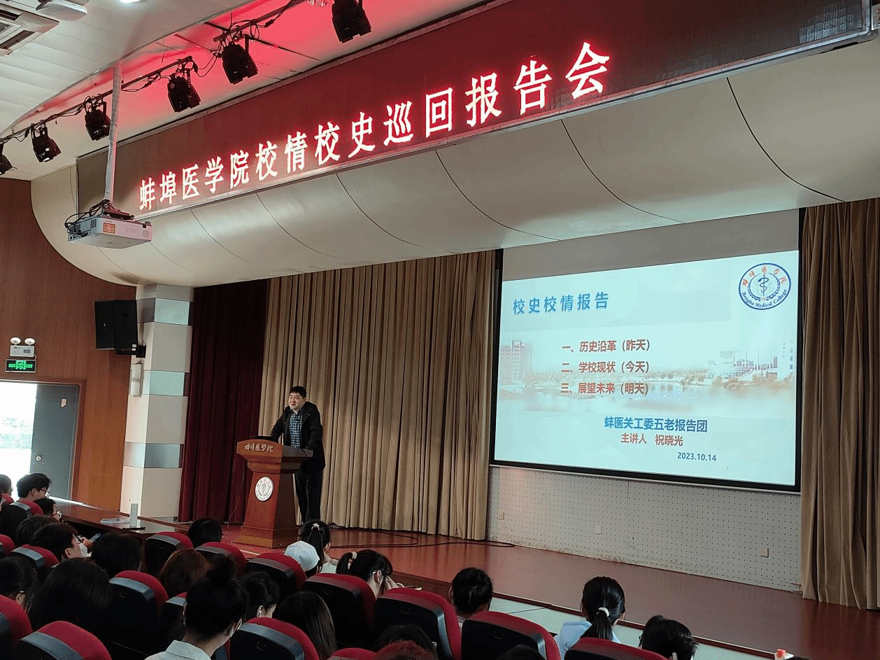 为进一步增强太阳成集团官方网站2023级新生对学校校史校情的了解,10月14日上午,校关工委祝晓光教授在大学术报告厅为太阳成集团官方网站近300名全体进行“蚌埠医学院校史校情”宣讲。