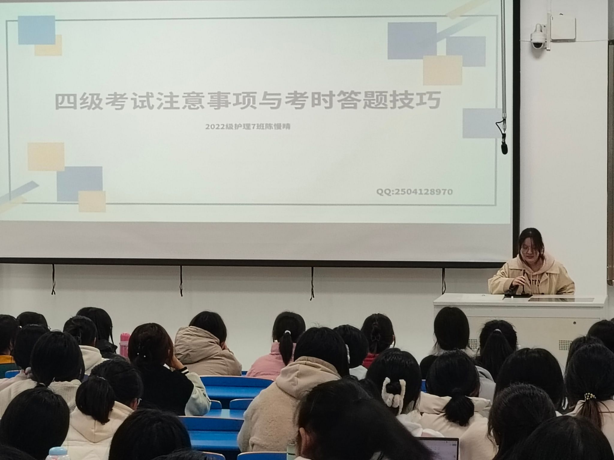随后,陈慢晴同学就四级考试注意事项与考试答题技巧与大家交流,对于四级考试的准备,陈慢晴同学强调了考场注意事项,提醒同学们提前熟悉考场规则,减少失误。在考试技巧方面,陈慢晴细致的向同学们分享了每一个题型的答题技巧,最后给同学们分享了校内与网络上的信息检索渠道,让同学们能够有效利用各种渠道提升学习效率。交流结束时,年级辅导员张叶群老师进行总结,向23级新生强调考试诚信,并祝愿同学们都能顺利通过四级!