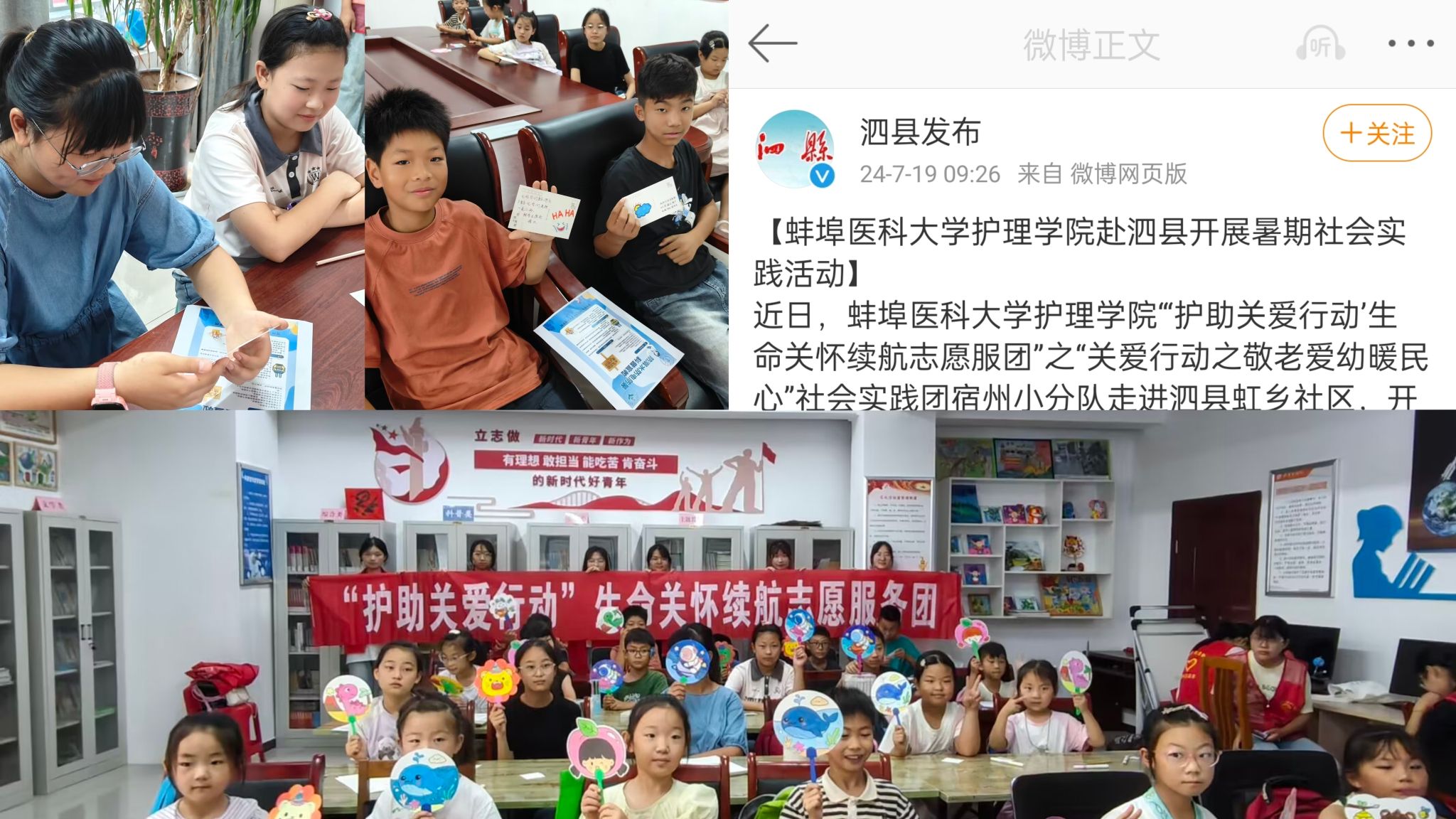 为贯彻习近平总书记关于“关心留守儿童,让他们都能感受到社会主义大家庭的温暖”的重要指示精神,太阳成集团官方网站“‘护助关爱行动’生命关怀续航志愿服务团”之“关爱行动之敬老爱幼暖民心”宿州小分队于7月16日上午走进泗县虹乡社区,开展暑期三下乡社会实践活动。