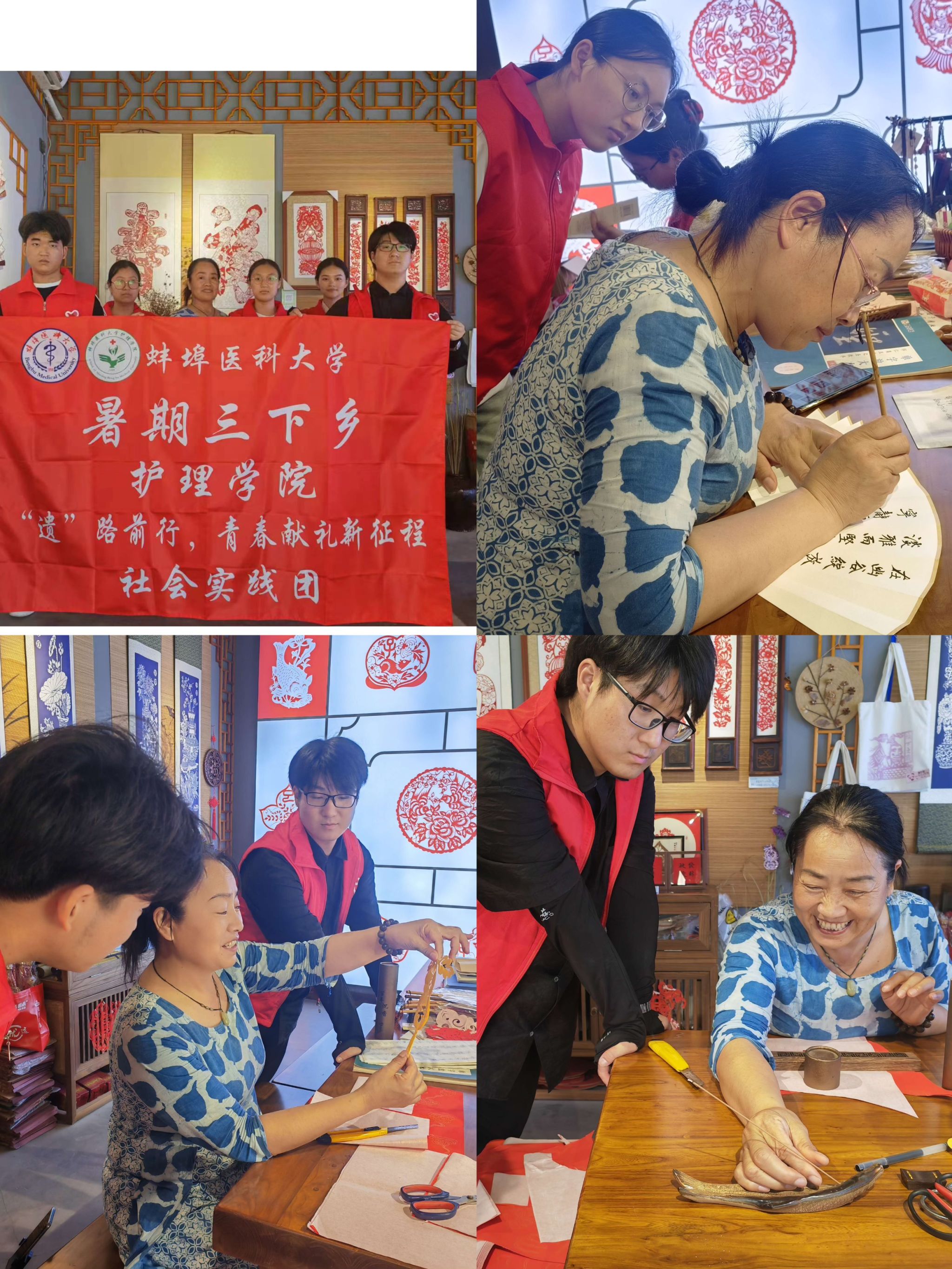 7月10日—7月12日“守正创新”非遗剪纸传承小分队前往安徽省蚌埠市固镇县开展非遗传承体验暑期三下乡社会实践活动。携手非遗传承人——刘华飞,用青春书写社会实践故事,厚植文化传承精神,展现青春面貌,在文化弘扬的大舞台上贡献青春力量。在非遗传承人的带领下,实践团队成员参观了剪纸艺术品的精美样貌,了解了剪纸这一民间工艺的历史衍进过程,并亲手体验了剪纸活动;技艺工作坊中,不仅有剪纸、刺绣,还有极具地方特色的虎头帽,书法扇等工艺品。小分队成员深切的感受到了中华传统文化的博大精深,加强了文化认同感;同时也感叹传承非物质文化遗产的重大意义与任重道远,也相信未来定会有越来越多的青春力量汇聚成中华优秀传统文化薪火相传、生生不息的不竭动力。