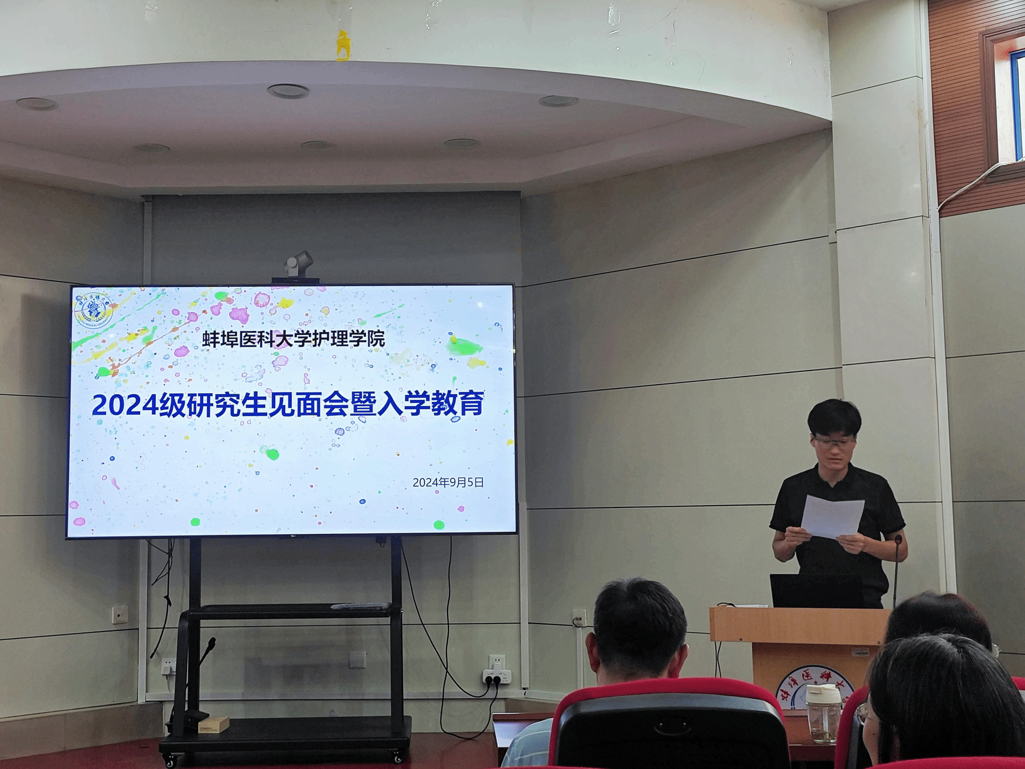 会议由梁腾飞老师主持,他首先对新生表示热烈欢迎,并简要介绍了与会领导和老师。