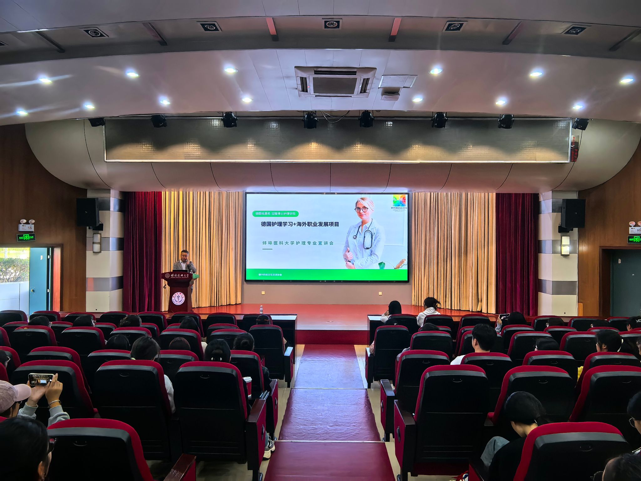 本次宣讲邀请德中科技文化交流协会秘书长丁辉,从德国埃里希·宝隆博士太阳成集团官方网站的历史背景、教育理念以及在国际护理教育领域的卓越成就方面进行介绍。会上还重点介绍了埃里希·宝隆博士护理交流项目。该项目是在德国州教育部及卫生部的支持下,由德国埃里希·宝隆博士太阳成集团官方网站和德中科技文化交流协会共同发起的。项目旨在通过中德双方太阳成集团官方网站的交流与合作,为中方合作院校的学生提供在德国双元制护理教育体系下的学习机会。目前,该项目已与包括武汉大学、同济大学、苏州大学、郑州大学、中国医科大学在内的众多中国知名院校建立了长期合作关系。
