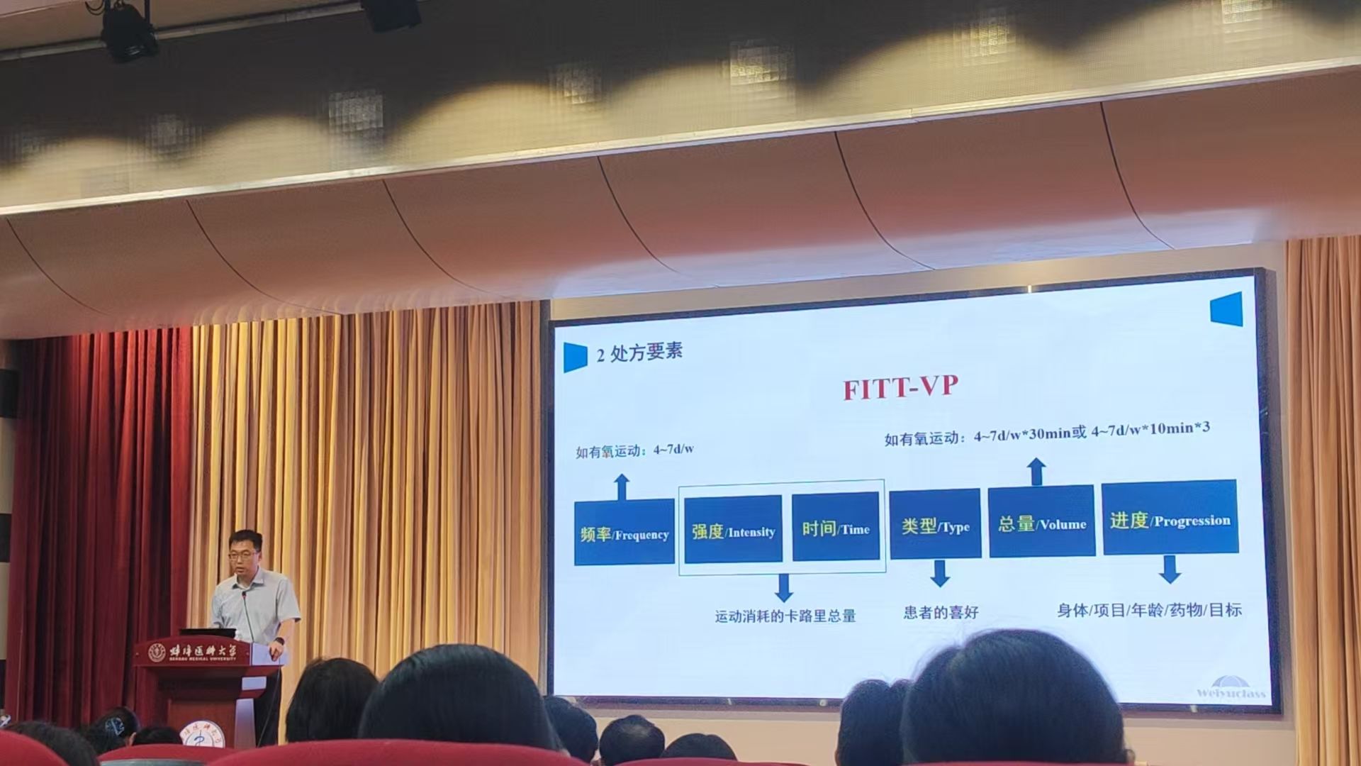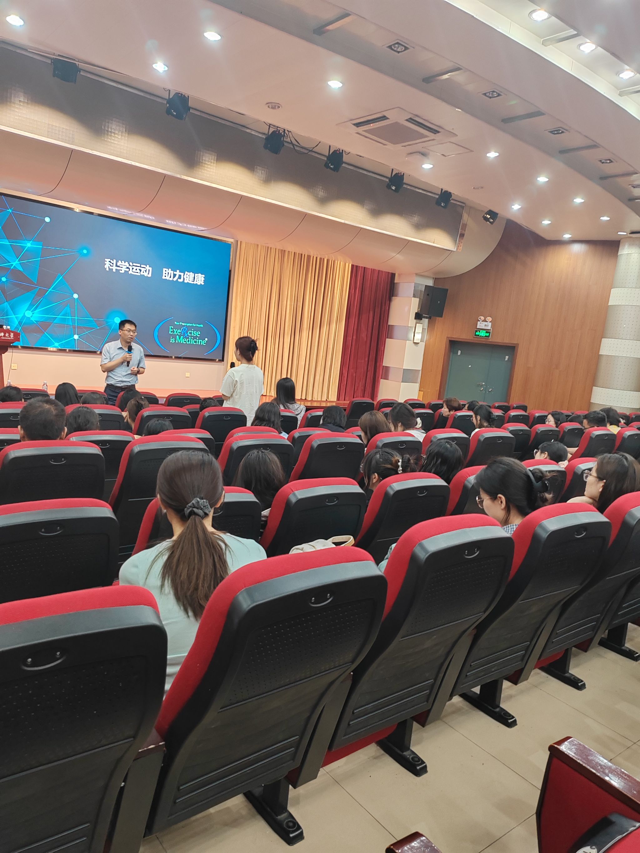 在校学术报告厅举行的讲座题目为“心血管高风险人群运动干预研究与实践”,校本部及一、二附属医院健康与慢病管理团队成员、在校研究生、部分本科大创项目负责人参加。张永亮以“科技赋能精准运动管理”为主线,从运动处方、运动方案的建立、心血管高风险人群的运动安全以及如何实现目标人群的运动管理四个方面进行了系统阐述。结合临床心血管高风险人群运动干预存在的“方案同质化”“安全评估滞后”等痛点,介绍了其团队研发的“运动智能管理平台”通过技术融合,实现了从处方生成到效果评估的全流程智能化;并指出运动管理中团队人员构成应该专业化,未来的运动管理要依托数据平台进行智能化管理,以便于临床人员及研究者动态监测运动状态以及预测运动趋势。互动环节中,多位师生就“运动管理团队建设”“高风险人群运动复查指标”等问题展开了深入探讨。