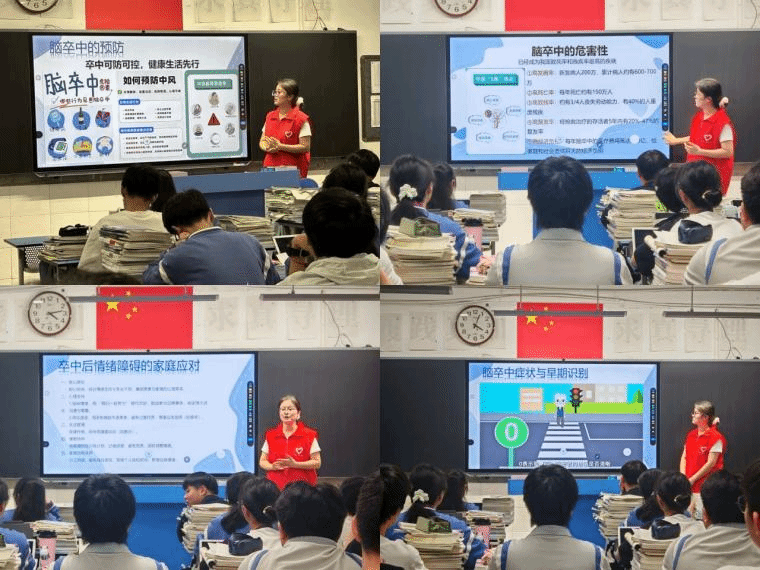 活动伊始,“心晴”脑卒中家庭护航者健康服务团成员通过问卷调查,科学评估了中学生对脑卒中相关知识的认知水平。随后,宣讲人汪诗宇同学采用多媒体宣讲、科普视频展播等形式,系统讲解了脑卒中的发病机制、典型症状及早期识别方法。结合相关案例,汪诗宇同学深入剖析了健康生活方式在卒中预防中的重要意义,并重点阐释了卒中后情绪障碍的家庭应对策略,强调科学照护、心理支持及社会关爱对患者康复的关键作用。宣讲还引导青少年关注卒中患者的身心健康,助力构建家庭与社会协同支持体系。在互动问答环节,同学们踊跃参与,现场气氛热烈。团队通过有奖竞答的形式巩固科普成效,进一步激发了同学们的学习积极性,并向表现优异者发放了健康宣传手册及纪念品。