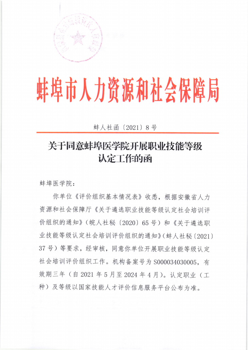 关于同意蚌埠医学院开展职业技能等级认定工作的函