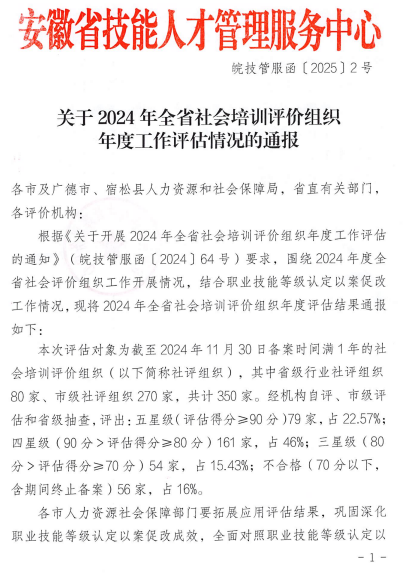 近日,2024年度全省社会培训评价组织工作评估结果正式揭晓,我校以卓越的培训质量、创新的服务模式及显著的社会效益,在全省350家参评单位中脱颖而出,获评最高等级“五星级单位”。