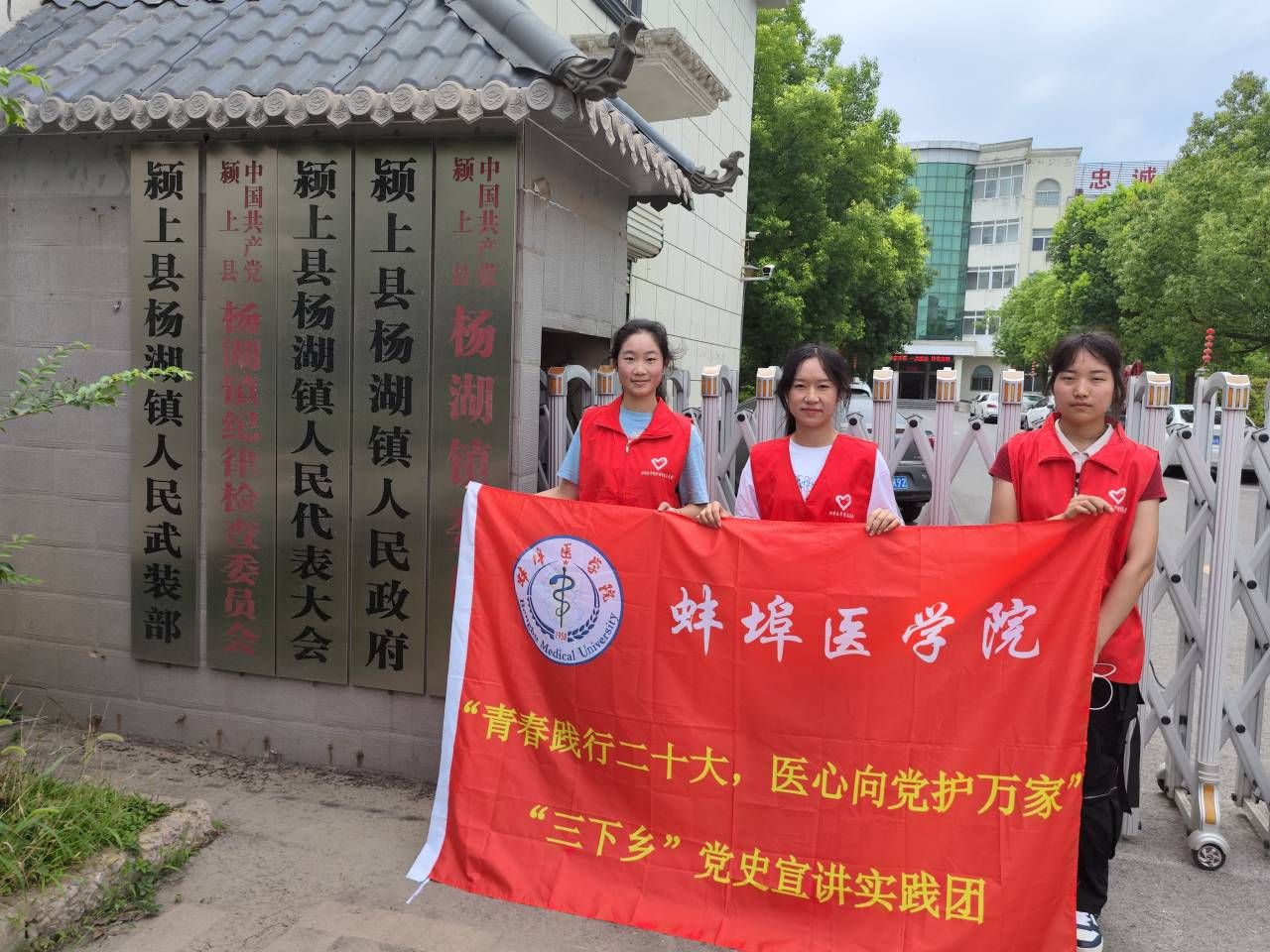 为了更好的践行不忘初心跟党走,切实体会青年大学生新时代的责任与担当,蚌埠医学院“青春践行党的二十大,医心向党护万家”实践队通过寻访乡村党支部,去倾听党的红色故事,追溯红色记忆。深刻感受基层党组织在推动乡村发展的引领作用,将新时代的健康文明新风写入青春热血,深刻体会新时代的农村发展。社会实践团队于7月16日前往阜阳市颍州区第四中学、颍上县杨湖镇人民政府和江苏省泰兴市进行实地走访和调研。