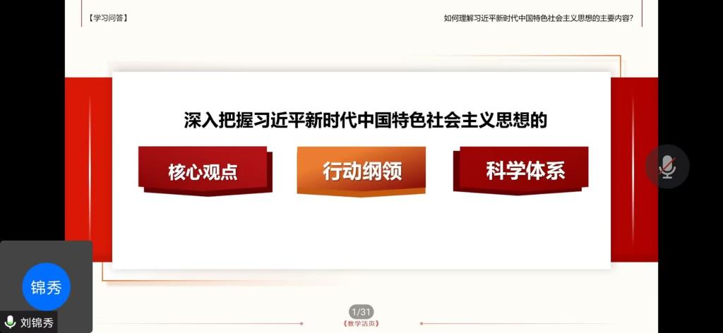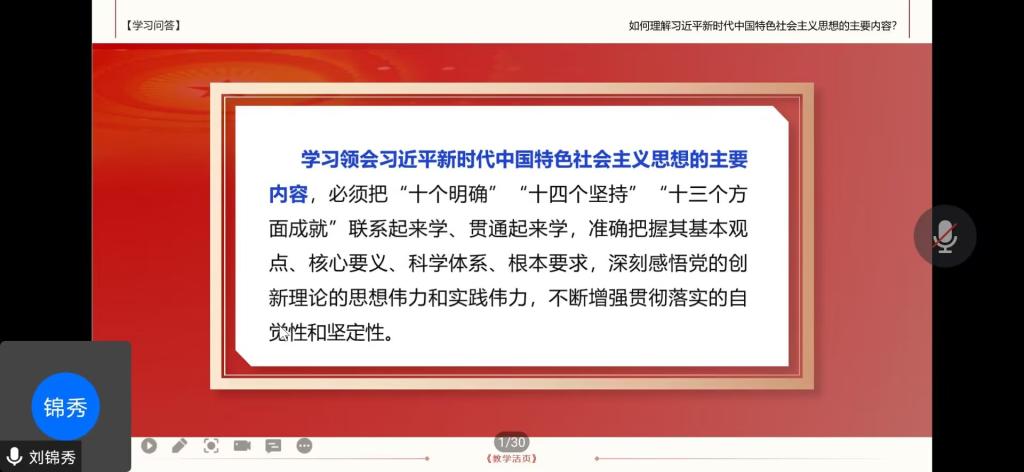 微团课紧紧围绕习近平新时代中国特色社会主义思想这条主线,从“十个明确”“十四个坚持”“十三个方面成就”等方面,深入分析了习近平新时代中国特色社会主义思想的核心观点、行动纲领、科学体系。刘锦秀老师强调要把”十个明确”十四个坚持”十三个方面成就”联系起来学习,准确把握其基本观点、核心要义、科学体系、根本要求,深刻感悟党的创新理论的思想伟力和实践伟力。