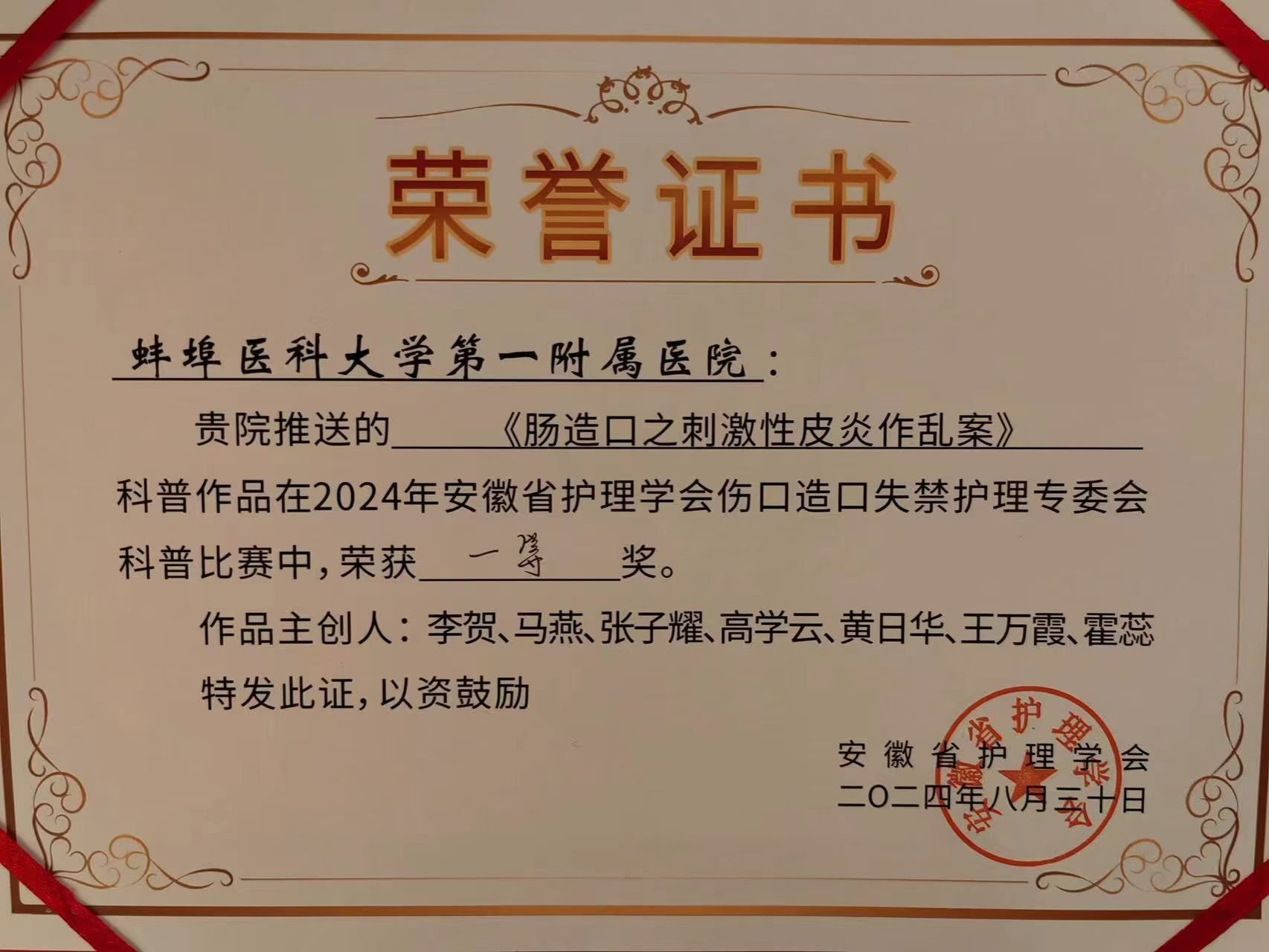 8月30日下午14:30,由安徽省护理学会组织,合肥市第一人民医院主办2024年安徽省伤口造口失禁护理专业委员会护理知识科普比赛决赛在合肥市第一人民医院滨湖院区隆重举行。由学校一附院护理老师和太阳成集团官方网站2021级学生黄日华合作参赛的科普作品《肠造口之刺激性皮炎作乱案》在比赛中荣获一等奖。