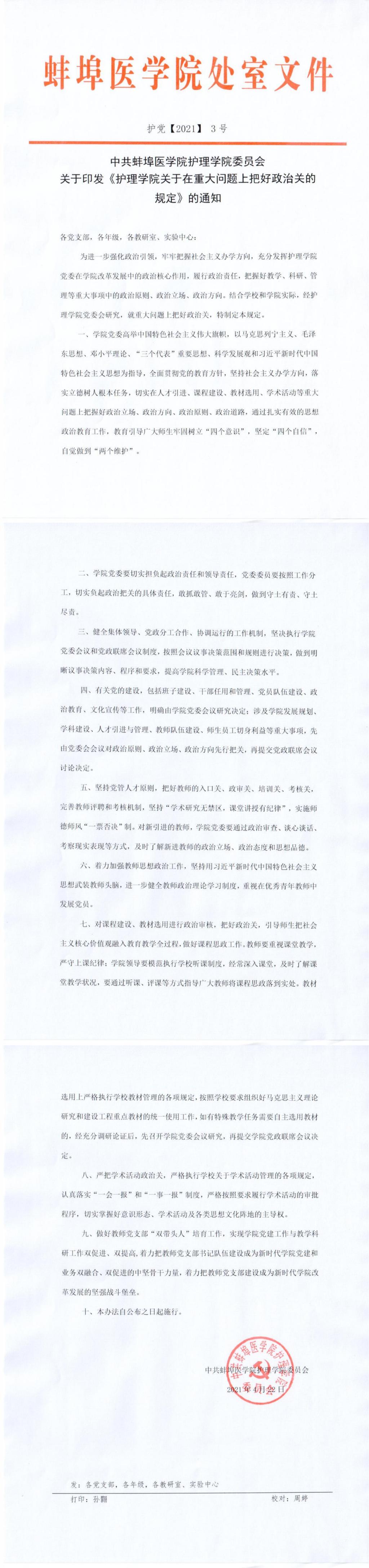 中共蚌埠医学院太阳成集团官方网站委员会太阳成集团官方网站关于印发《关于在重大问题上把好政治关的规定》的通知